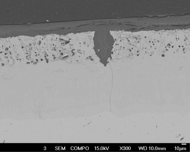 按比例扩大涂层的实际尺寸的GME,正如我们在涂层的横截面图中所看到的:每一层都很平滑地相互融合,优点是将消除涂层结构中各层之间的界面,并提供更好的抗氧化和硅向内扩散的能力,而且涂层与基体之间没有形成Mo氧化物层。
