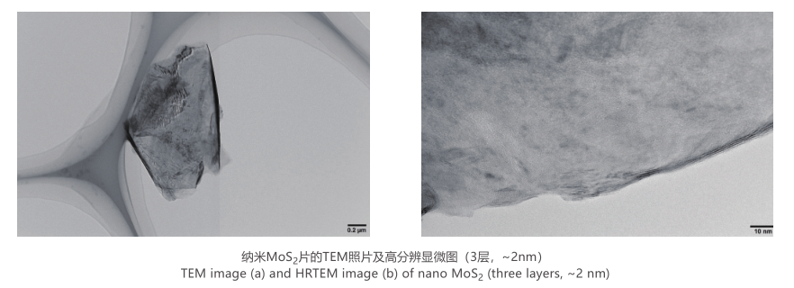 纳米二硫化钼是二硫化钼应用的一个新尝试。二硫化钼纳米片是一种纳米级晶体,随着二硫化钼的粒径变小,抗摩擦性能得到了极大地提升,虹鹭开发出的二硫化钼纳米片材料粒径分布窄、分散性好、片层厚度稳定在2~10nm,质量稳定。