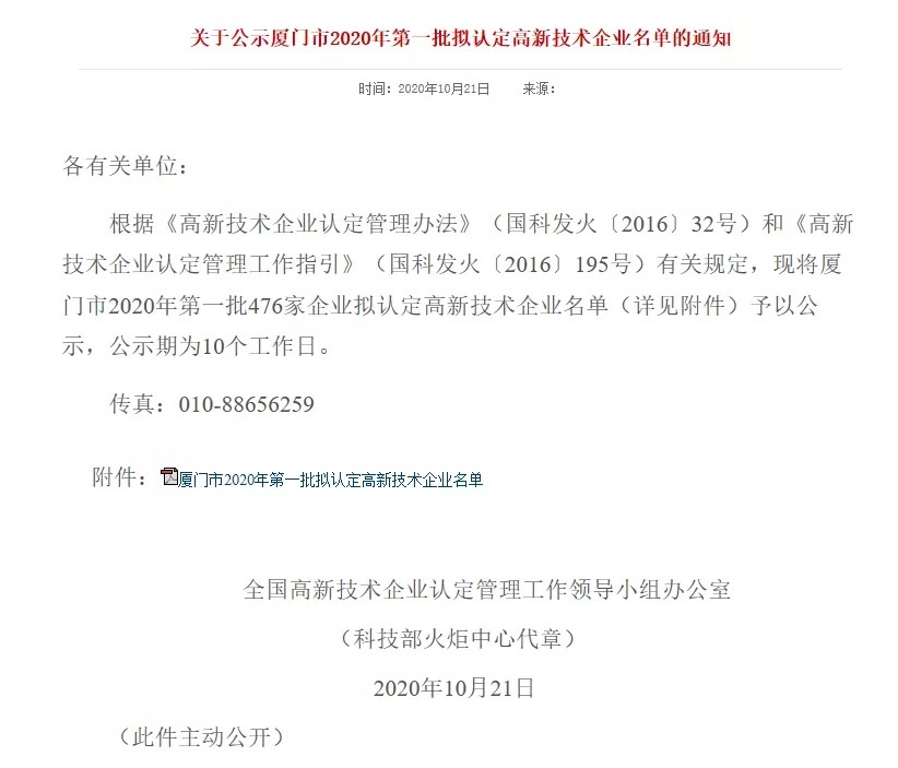 以下为《关于公示厦门市2020年第一批拟认定高新技术企业名单的通知》公示通知文件。