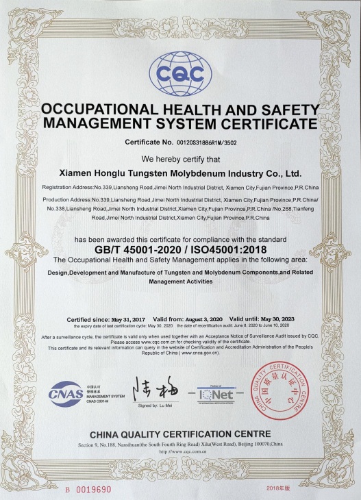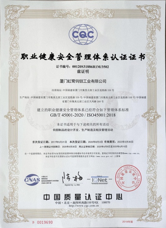 2020年8月3日,厦门虹鹭获得由中国质量认证中心(CQC)颁发的ISO 45001职业健康安全管理体系认证证书,顺利完成从OHSAS 18001到ISO 45001的转换。这是公司根据国家规范要求率先完成OHSAS相关领域认证标准的转换。此次管理体系认证证书的颁发,意味着厦门虹鹭在职业健康安全管理上紧贴国际先进管理模式,在规范化、标准化管理和可持续发展的道路上迈上了一个新的台阶。